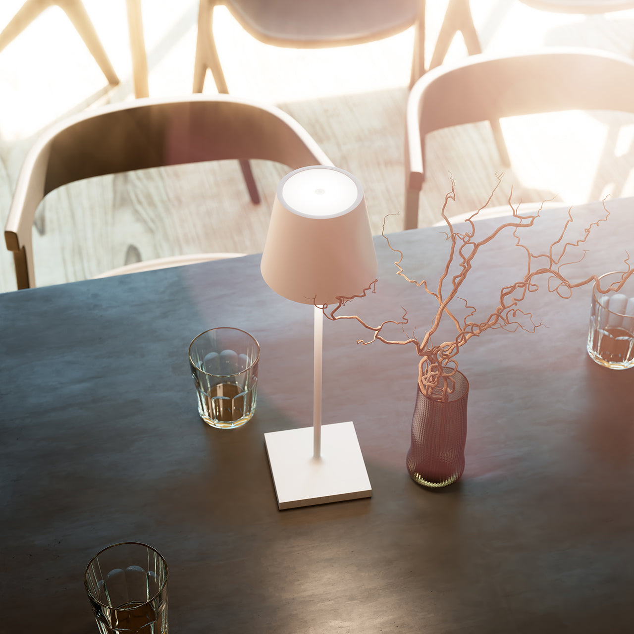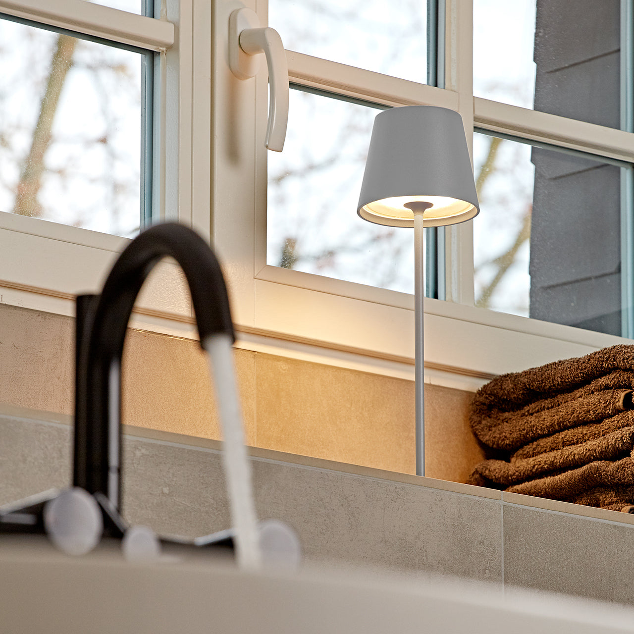 Dank der robusten Verarbeitung und der Schutzart IP54 ist die kabellose LED-Tischleuchte spritzwassergeschützt und eignet sich ideal für Terrasse, Balkon oder Garten. Selbst ein kurzer Regenschauer kann ihr nichts anhaben.