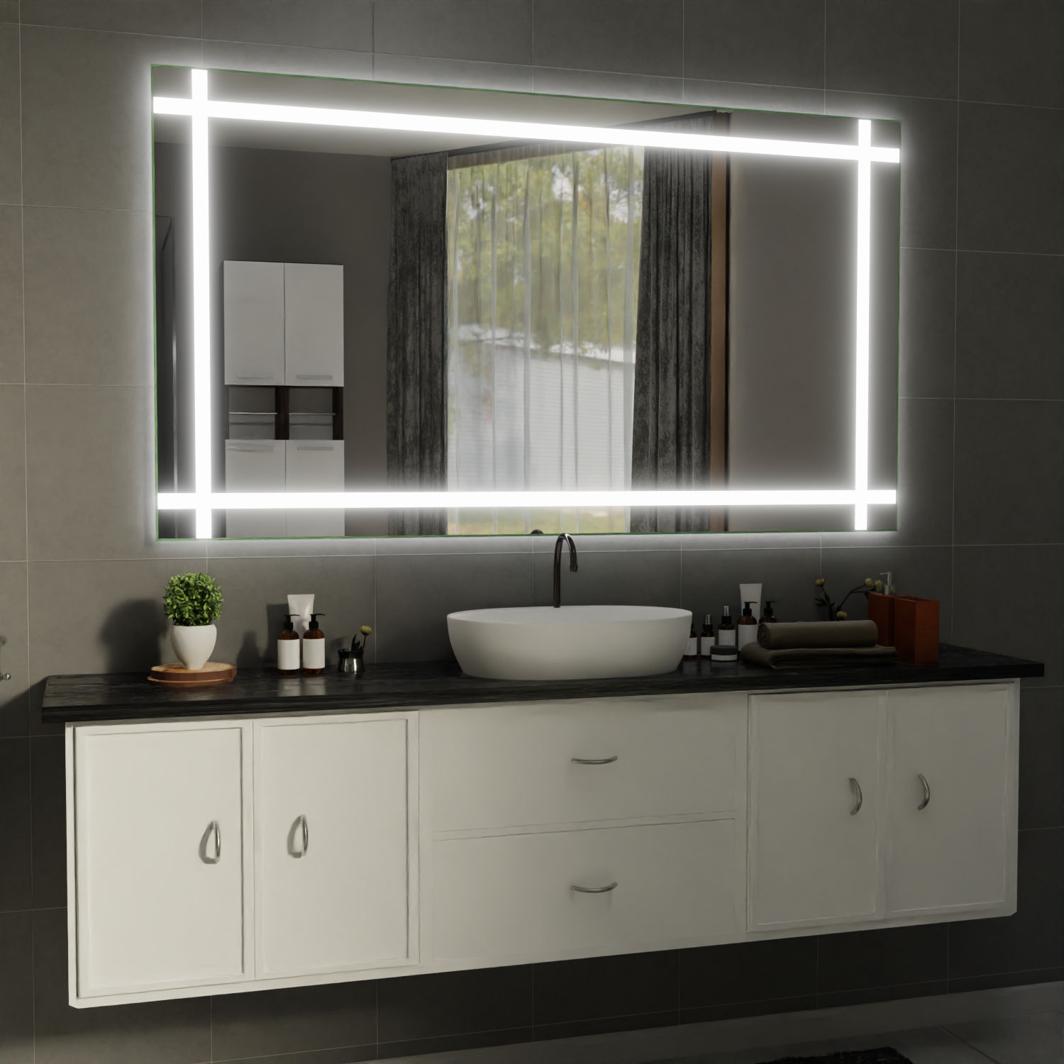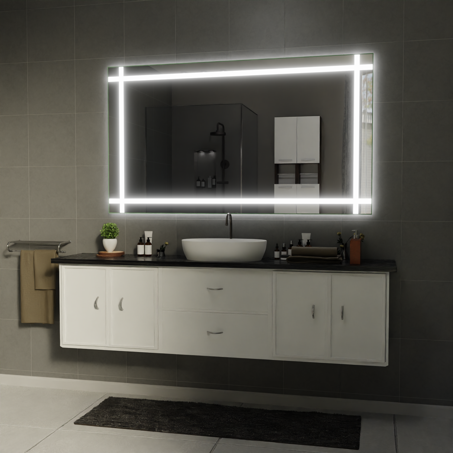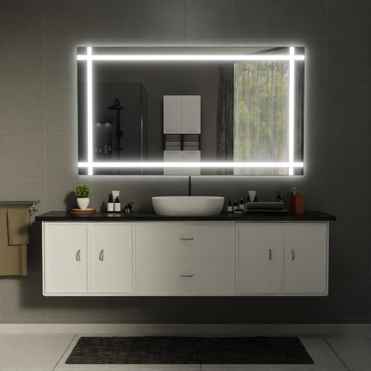 Die vier 15 mm breiten, satinierten Lichtstreifen sind präzise an der oberen, unteren, linken und rechten Kante des Spiegels integriert und sorgen für eine gleichmäßige, blendfreie Ausleuchtung.