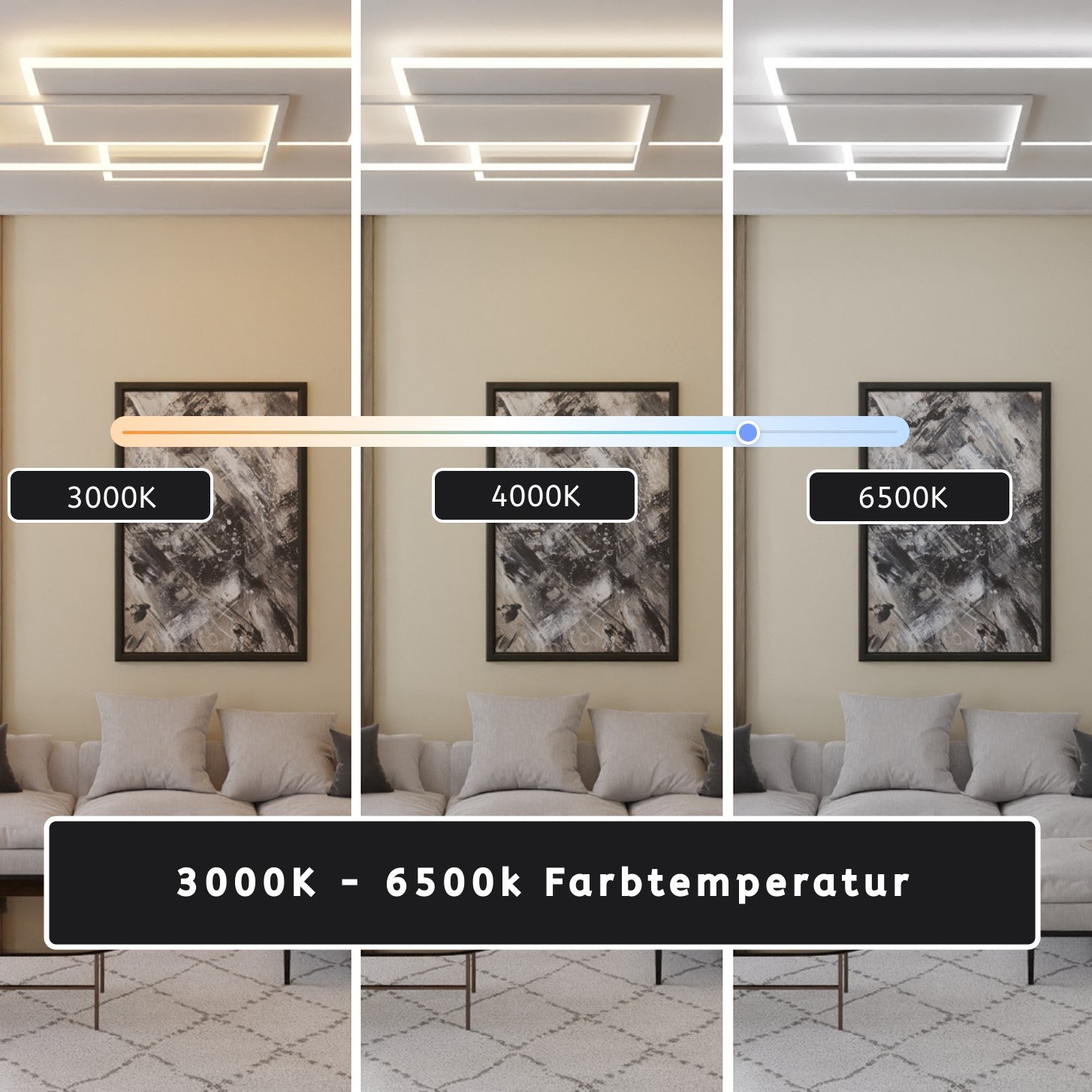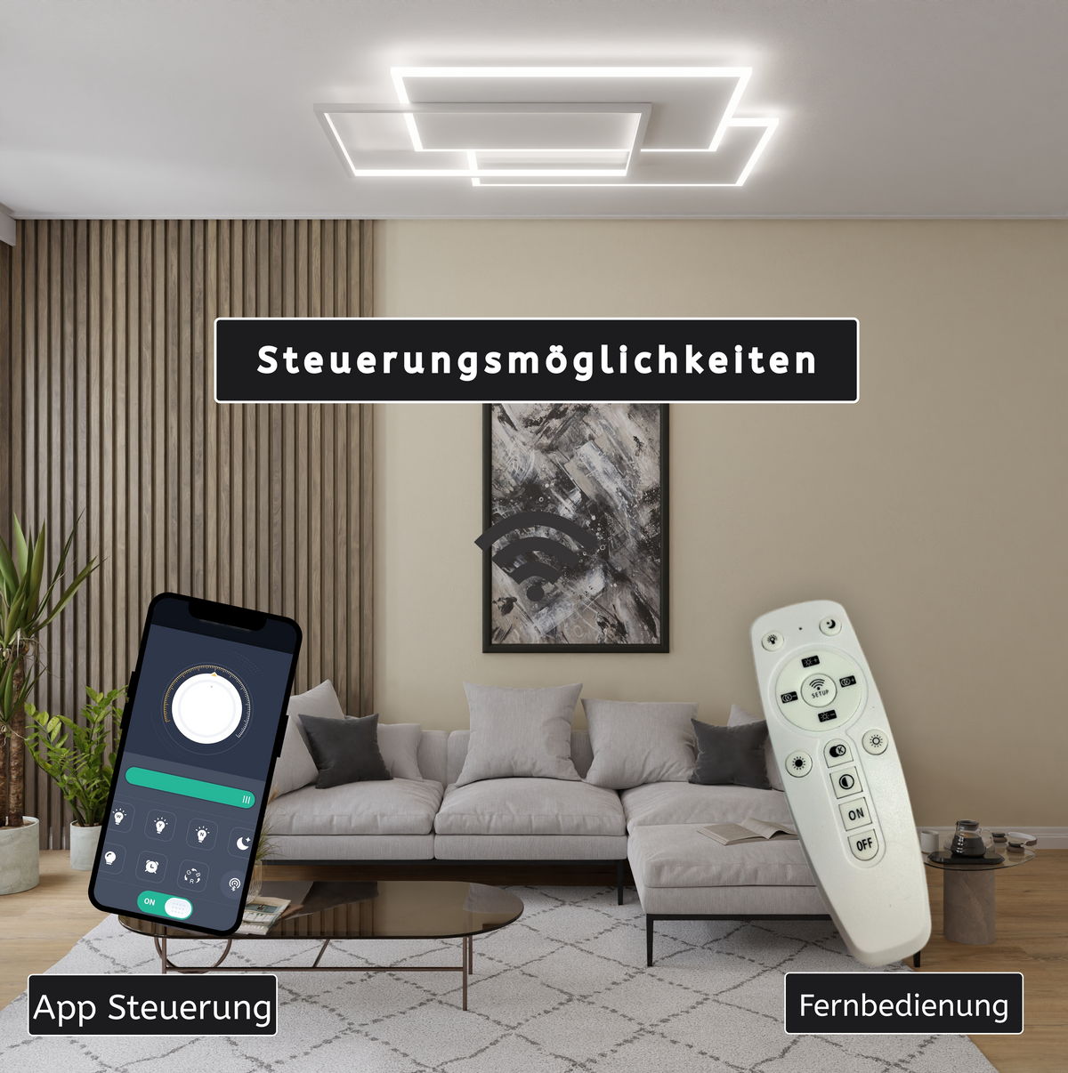 Gefertigt aus Metall und Acrylglas wird die LED – Deckenlampe zum Highlight in Ihrer Wohnung. Steuern Sie die LED – Lampe ganz einfach mit der mitgelieferten Fernbedienung oder mit Ihrem Smartphone per App an. Die Lampe ist stufenweise dimmbar, bietet Ihnen einen Farbwechsel in warmweiß, neutralweiß und kaltweiß und passt sich so Ihren individuellen Bedürfnissen optimal an.