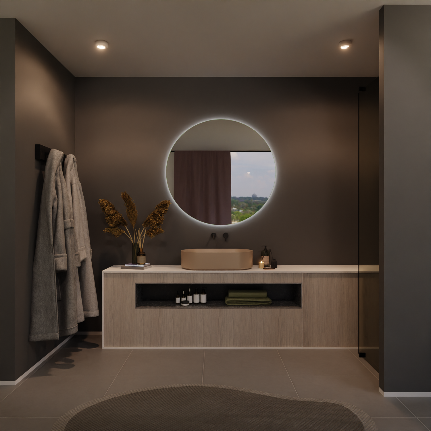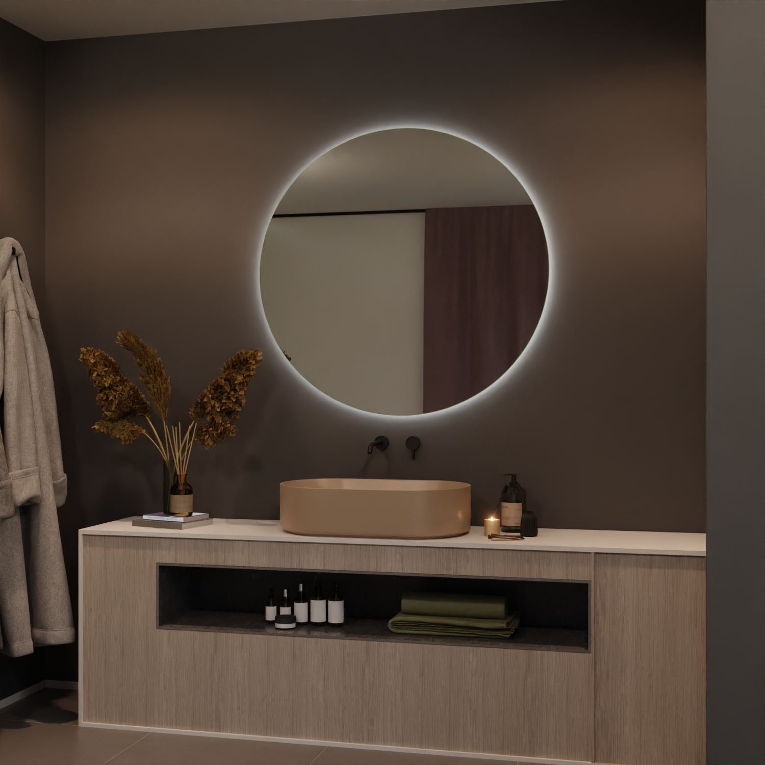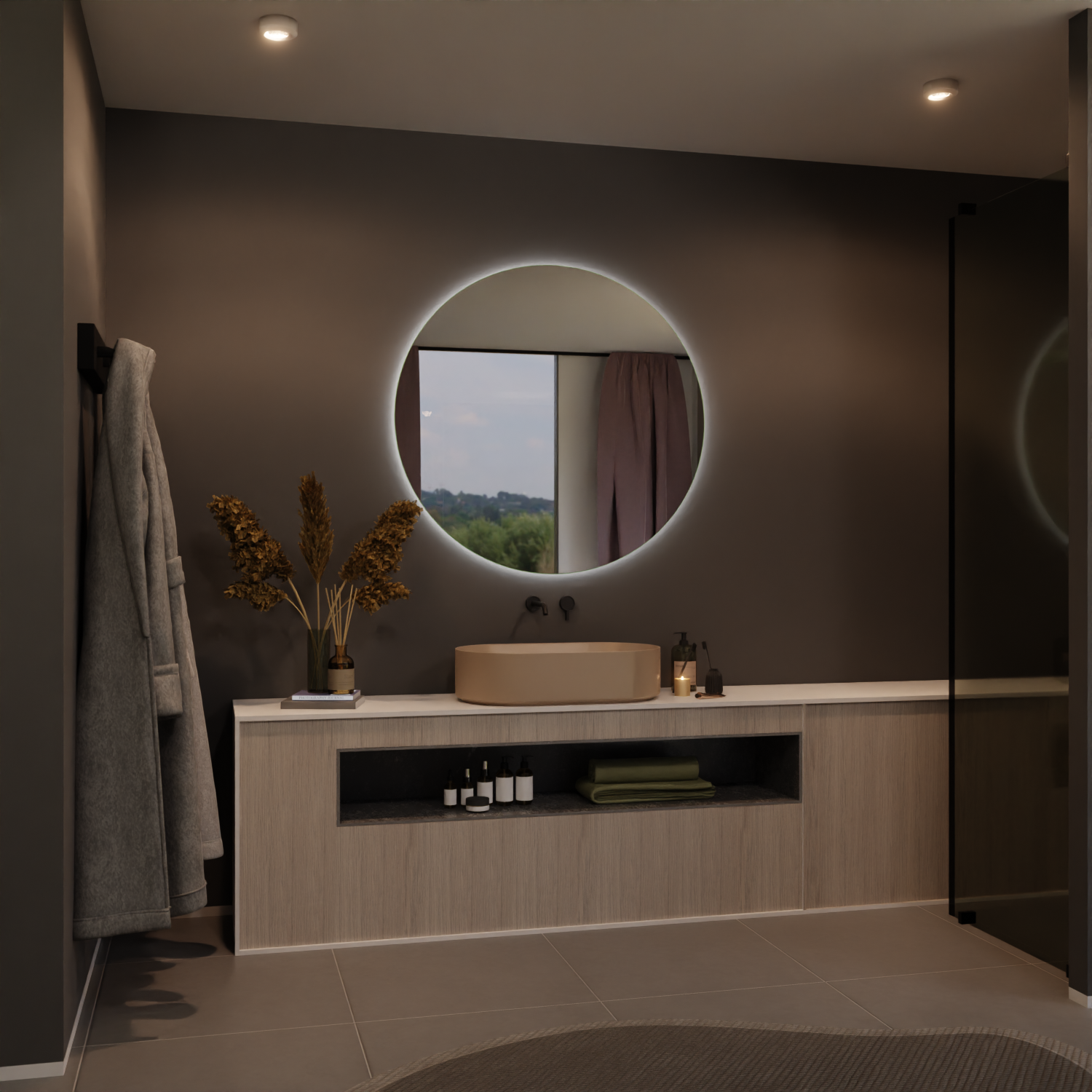 Der Runde LED-Badspiegel Sun bringt Licht, Ruhe und Stil in Ihr Badezimmer.